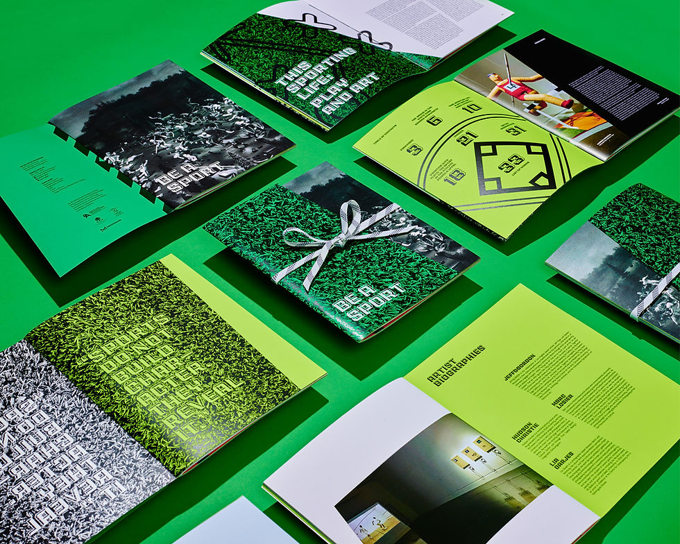 How do you mix art and sport? You bundle them up in a nice little package and wrap it (literally) with a hockey skate lace. When the Art Gallery of Mississauga launched its "Be a Sport" show during Toronto's 2015 Pan Am Games, we were asked to produce the catalogue for this exhibition exploring how competitive games are examined and understood. The catalogue's design features elements pulled from typical sport aesthetics, but used minimally in a subtle way in keeping with an art gallery feel. The table of contents is set up as a baseball diamond; athletic-looking fonts such as PowerStation Block are used to recall scoreboards; and photo cropping and copy layout play heavily with angles, referencing the geometric look of many sport-related ad campaigns.
