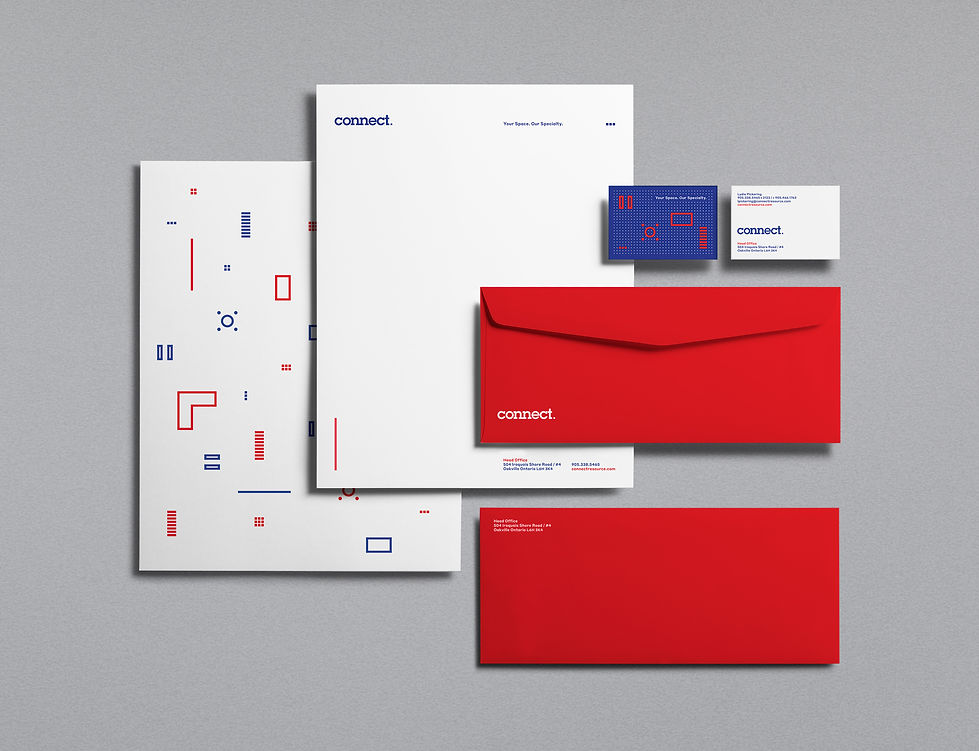 NAR's re-brand for interior design and facility management firm Connect Resource got us thinking about how to connect the dots. Having completed 20 years of operations and recently moved into a new space in the heart of Toronto's financial district, the firm was looking to project a new image of consummate professionalism even while maintaining a friendly, approachable demeanor. The look we created placed a number of simple geometric shapes (reflecting walls, furniture, and interior structures) on a dot-based grid, with the suggestion that the dots can be connected and reconnected in infinite ways. The firm is, we are saying, as open and flexible as the elemental designs it delivers. Supporting the presentation are energetic blues and reds printed on a UV press. Plain white is also available when a more restrained feel is called for. Connect Resource clients include Brookfield Properties, Oxford Properties, Manulife and QuadReal amongst others.